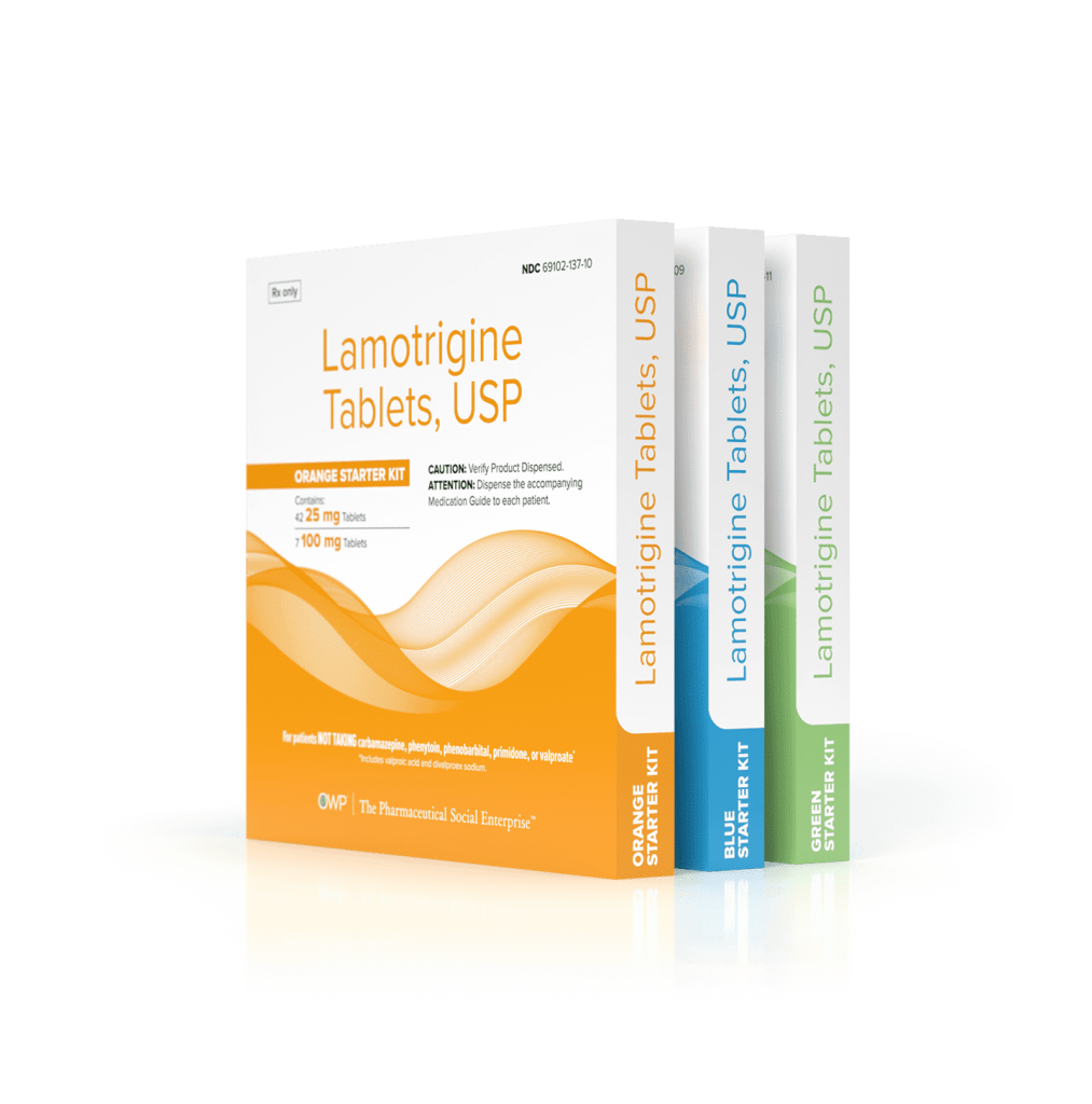 OWP offers three Starter Kits (Orange, Blue, and Green), each based on FDA-approved 5-week titration schedules, for patients initiating lamotrigine therapy. These Kits help healthcare providers titrate their patients appropriately to the therapeutic dose, as supported by clinical studies.
